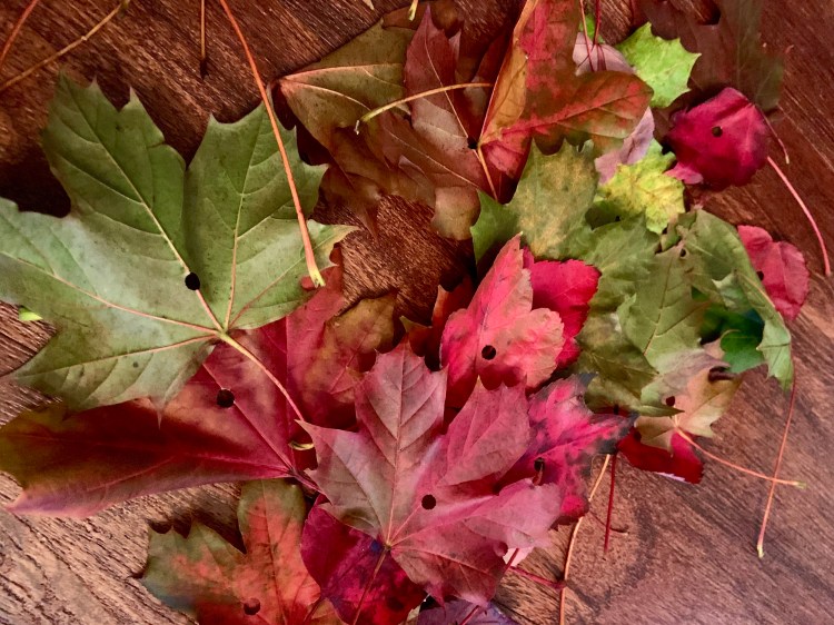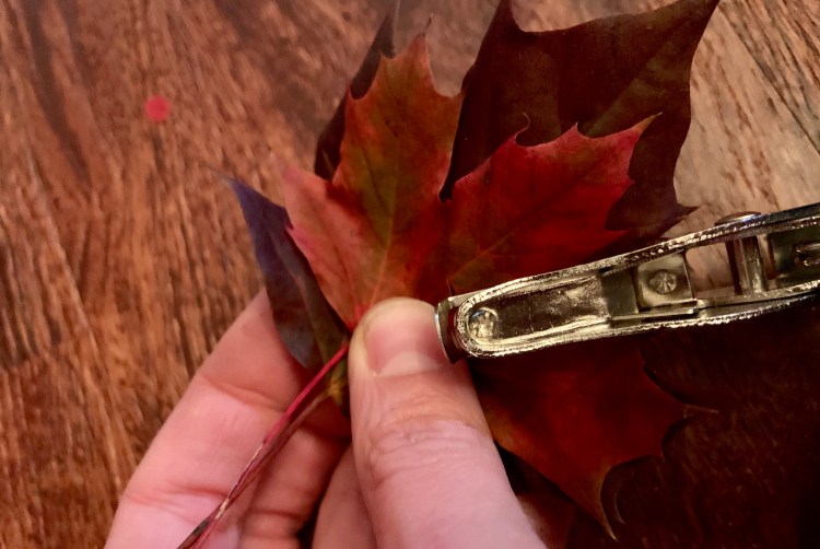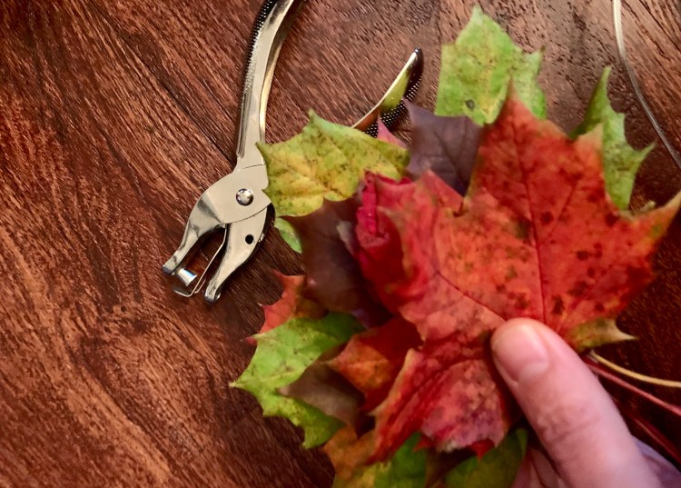Second, you stack the collected leaves in small piles of about 4-5 leaves thick and paper punch holes through their centers. You do this until you have enough leaves for your wreath. I then chose to cut off my leaf stems with scissors as well so the wreath had a more rounded look when it was finished. This is up to you.