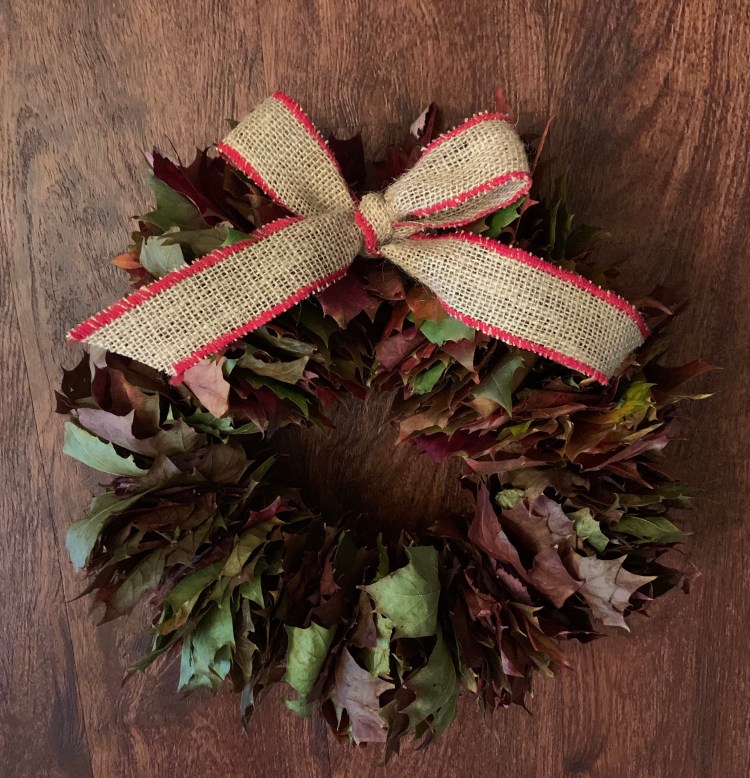 Next, you take your paper punched leaves and push them onto your wire hoop. Continue to add leaves until you get up to the top on each side of your hoop. When you have the size wreath you prefer, take the two wire ends and hook them together and twist to fasten. This wire is super pliable and easy to manipulate into form. After you have completed your circle, add a bow with the ribbon of your choice to your wreath and voila! A fun fall project that is not only frugal but also great to get your littles outdoors to collect their favorite colored leaves. We chose to collect the leaves on a mild day and put the wreath together on a stormy one.
